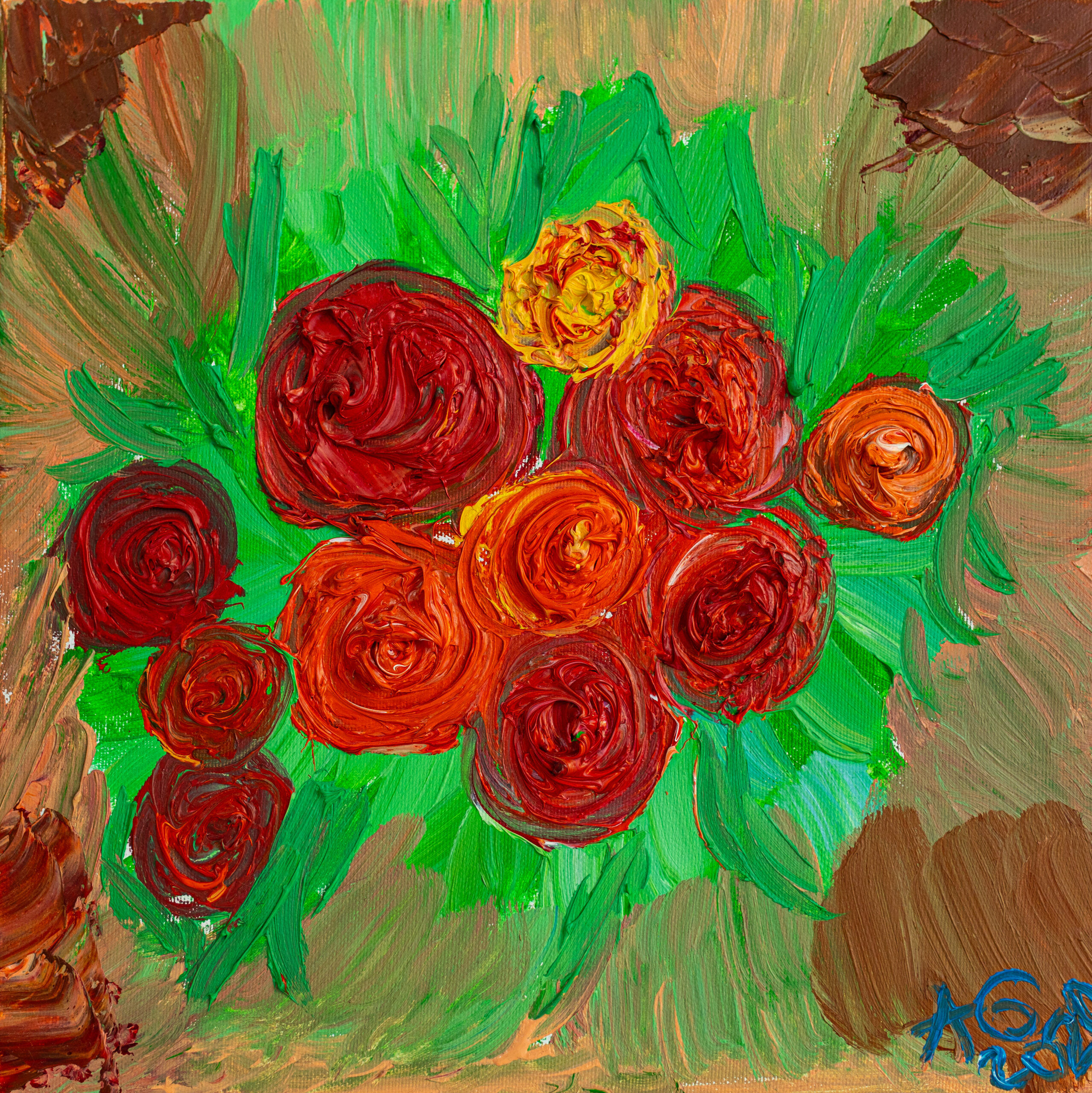 This vibrant bouquet of roses radiates warmth and joy, celebrating the beauty of nature in full bloom. Each flower, crafted with rich hues of red and orange, showcases the artist’s skillful technique, bringing the petals to life with textured brushstrokes. The lively green backdrop enhances the vivid colors, creating a striking contrast that draws the viewer’s eye. This piece captures the essence of love and passion, making it a perfect expression of heartfelt emotions. A true testament to the beauty found in nature, it invites admiration and reflection.