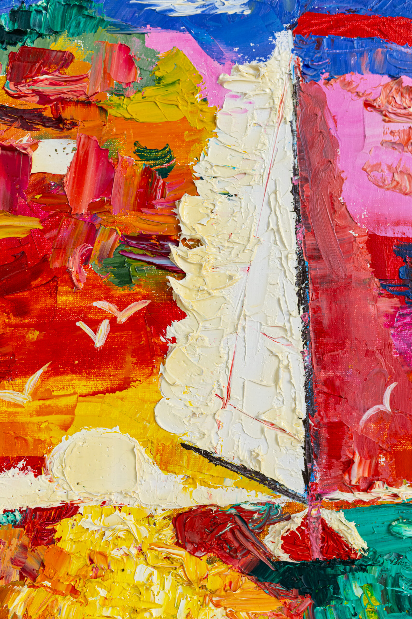 This vibrant painting captures the essence of adventure and freedom as a sailboat glides across a canvas of fiery reds and warm yellows, evoking the breathtaking beauty of a sunset. The contrast between the brilliant colors and the textured waves creates a dynamic sense of movement, drawing the viewer into the scene. Soft strokes suggest gentle winds guiding the boat, while hints of white symbolize the sails catching the last rays of sun. This piece embodies the spirit of exploration and the tranquility found in nature’s breathtaking moments.